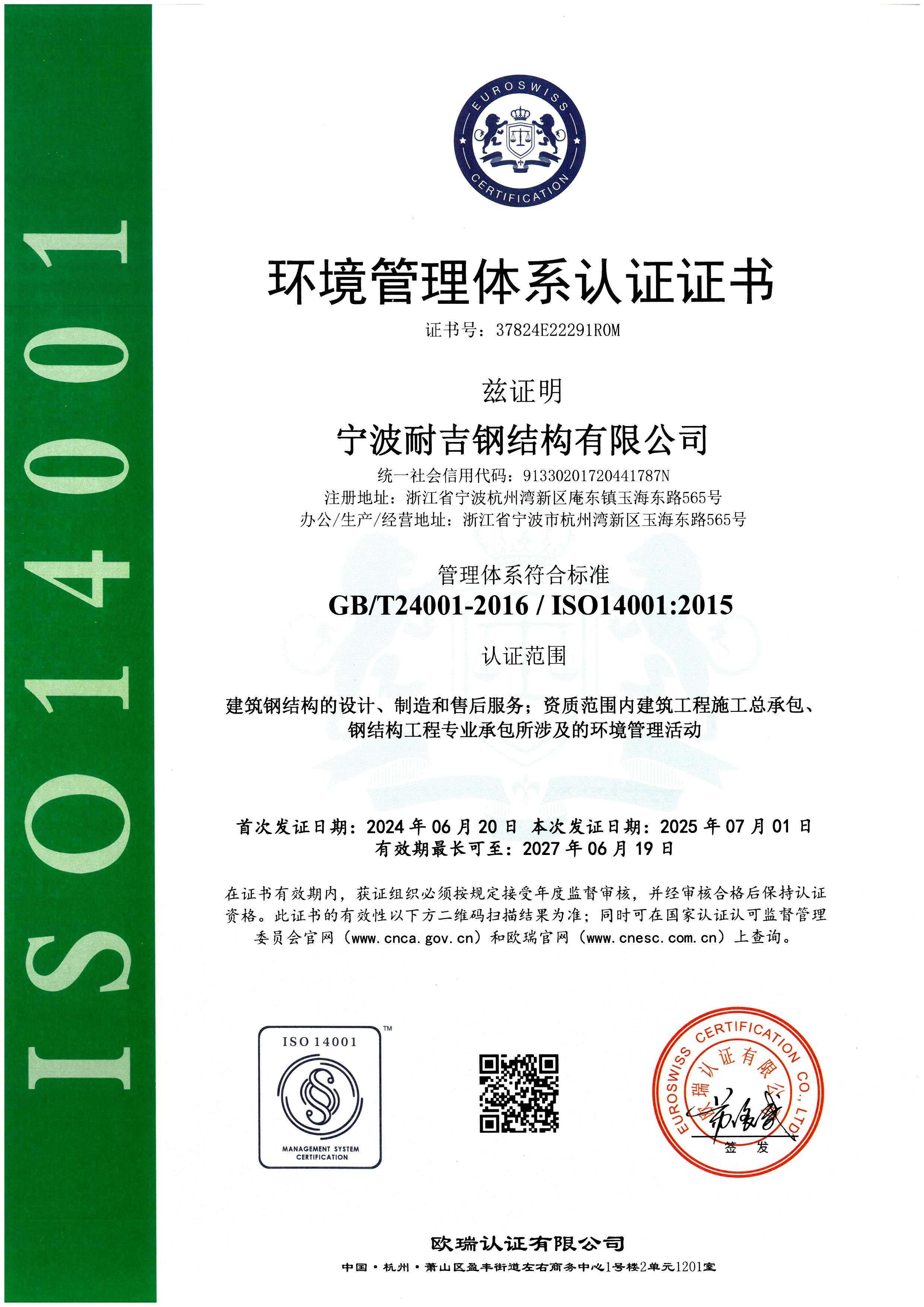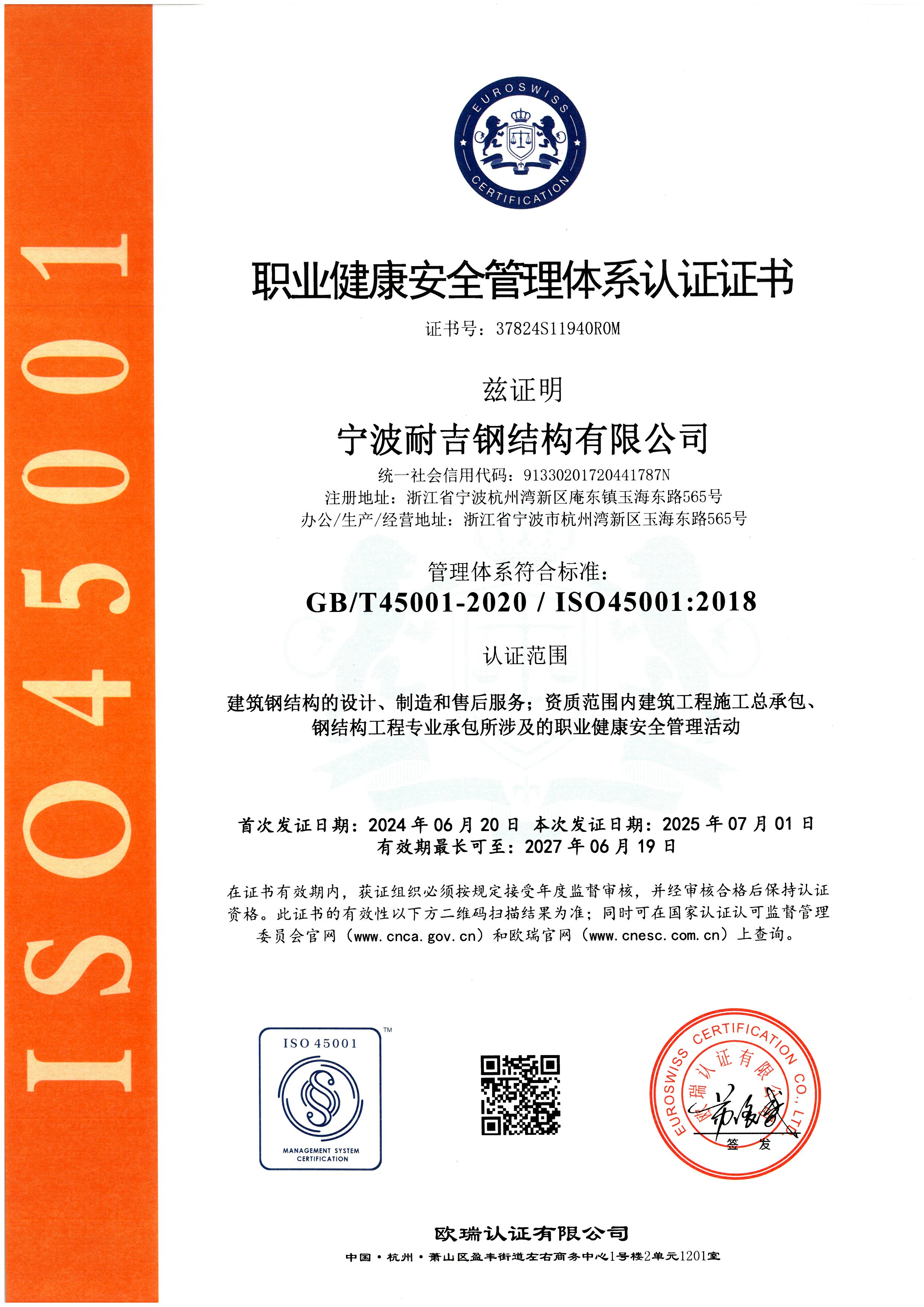宁波耐吉钢结构有限公司坐落于浙江省级新区--宁波前湾新区,是一家集设计、制造、施工和售后服务于一体的钢结构工程专业承包壹级、房屋建筑施工总承包贰级企业,公司通过了9000、14000、18000三位一体国际体系认证,廿余载发展,现业务范围遍及全国。