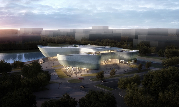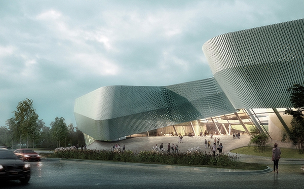 彩带舞蹈是一种中国的丝带舞,其历史可以追溯到汉代。一个专业的舞者能以简单的动作将彩带舞出游龙一般复杂的形式。丝带舞最初只有皇族才能享受,它的出现成为不同社会阶层之间沟通的重要媒介。受到这一古老的艺术形式的启发,展览中心的空间、结构及表皮如丝带般交织在一起。“丝带”从地平面开始,环绕包裹着建筑,限定了建筑的体量与流线。它引导参观者游历内部空间,控制建筑表面的光影,打开了对周围环境的视野。同时,它将各个元素链接到流动的空间中,巧妙地化解了传统的,静态的,“白色方盒子”式的展览馆形式。各个元素混合在一起,没有明确的物理边界。这种空间形式将游客对建筑、展览、人与社会的认知,整合成为一个连续的、流动的体验。